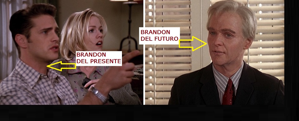 Brandon Walsh viajó en el tiempo en Sensación de Vivir. Y lo hizo a pelo, sin Deloreans, Tardis o jacuzzis (Jacuzzi al pasado, menudo clásico). Y la cosa es enrevesada: un Brandon del futuro, viejísimo y con el pelo blanco, viaja atrás en el tiempo para advertir al Brandon del “presente”, el de la 7ª temporada de Sensa, sobre su relación con Kelly. Además, este episodio fue dirigido por Jason Priestley, ¡Brandon dirigiendo a dos Brandons, pero qué locura es esta!