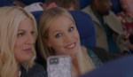 Luego las luces empiezan a parpadear y todo se vuelve como raro, la jukebox se funde, alguien misterioso entra por la puerta… ¿es Eleven, directly from Stranger Things? ¿Es Tiffany Amber Thiessen diciendo «you didn’t call me, you’re dead»? ¿Es, quizá, alguien de Lifetime para comprar los derechos de esto y producir de inmediato BH90210 The Unofficial Story of The Official Reboot? No, no, y no. Es una pesadilla de Donna… que despierta de repente en un avión Final Destination style junto a Kelly. No sight of Devon Sawa. Which is a good sign. Donna/Tori le pregunta a Kelly/Jennie que si es raro soñar con besar a tu ex-novio y su rubia amiga le dice que si es raro soñar con asesinar a tu ex-marido (que no sé si es el de Crepúsculo o uno de ficción)… vale, ahora estamos en la realidad aunque aún no sé si ellos son ellos o sus personajes.