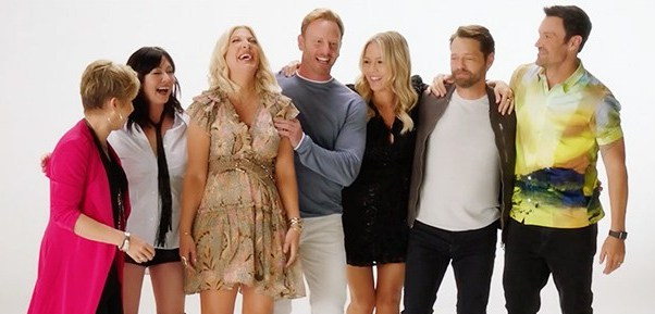 Empieza The Reunion con… eso, una reunión de todos los chicos en el Peach Pit (¡mítico!) con Brandon sirviendo burgers ¡con su camiseta del Peach Pit de toda la vida! (quiero una, por cierto, ¿dónde está Nat?). Kelly está detrás de la barra por algún motivo cuando no ha lavado un plato en su vida Hulio, y Donna, que es la que ha inaugurado el primer plano de la serie, le da un besito a David y le dice que le encanta cuando están todos juntos (¿está besando Donna a David o Tori Spelling a Brian Austin Green? ¡Una solución quiero!).