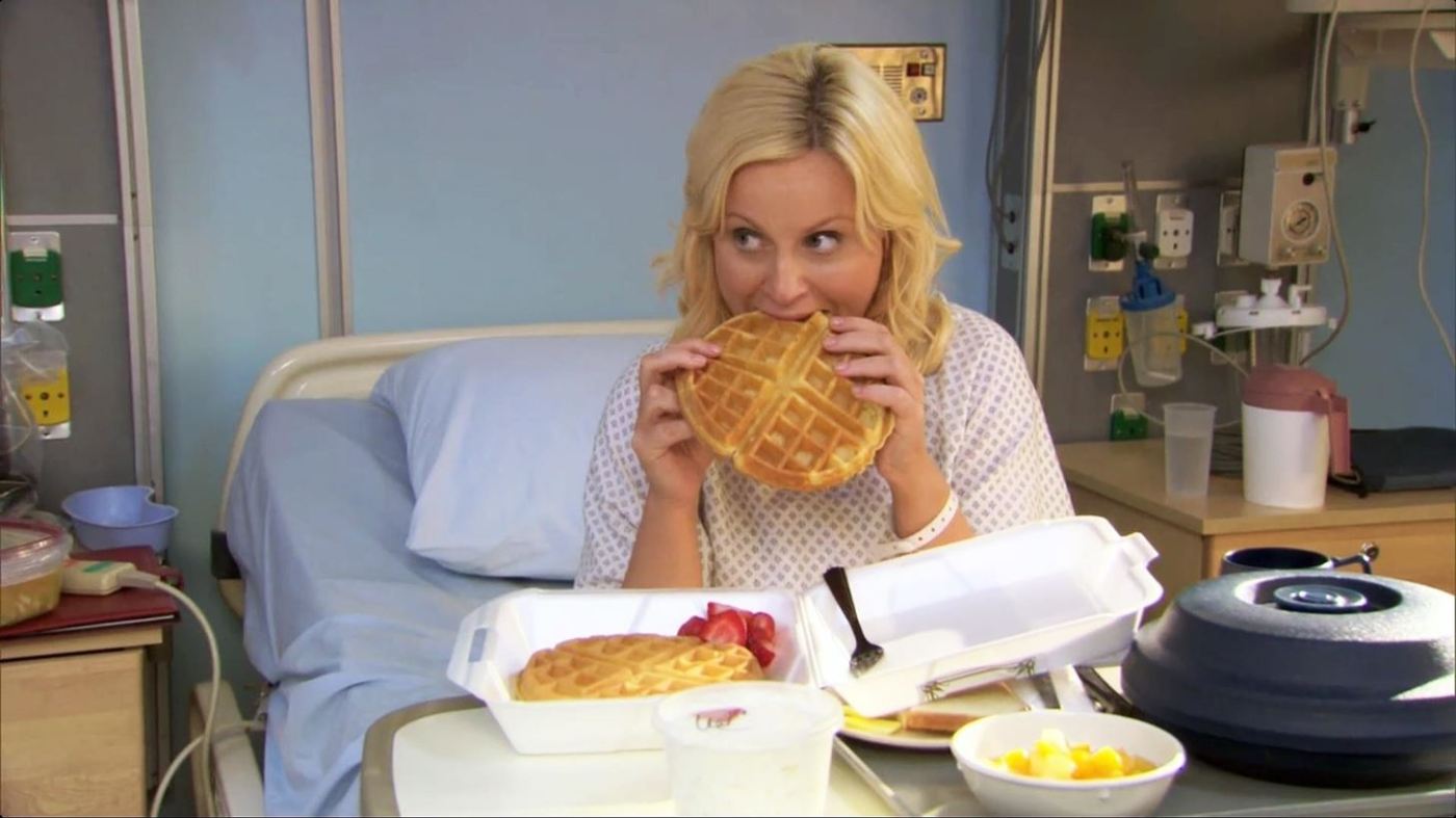 Yo había leído everywhere que Leslie y los waffles eran casi mitológico como el Agente Cooper y los cafés y las cherry pies… pero a finales de la tercera temporada, que es por donde voy, apenas he visto dos, quizá tres momentos donde Leslie ha declarado su amor por este dulce. Yo esperaba, no sé, a una persona obsesionada por los gofres…