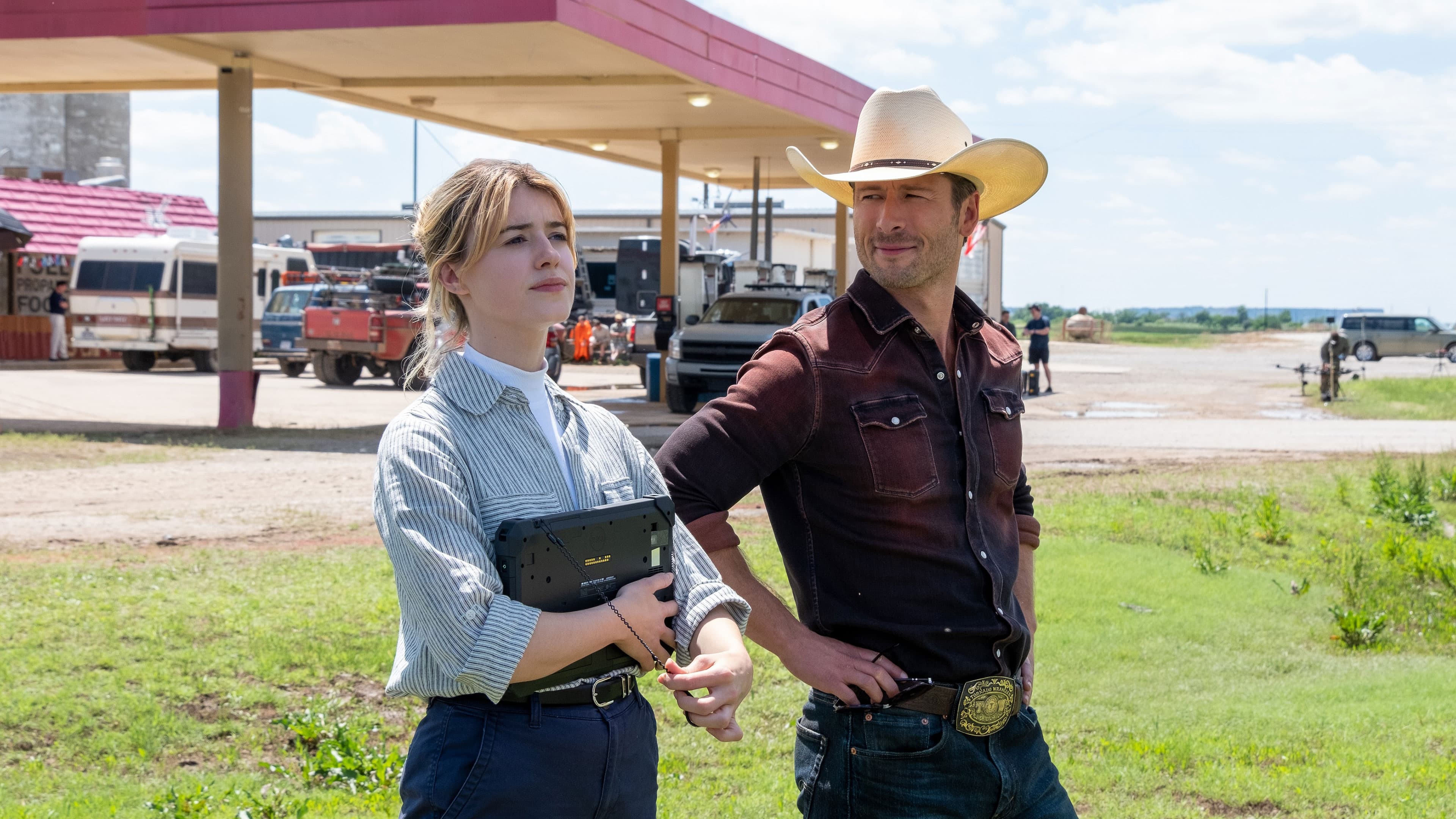 En Twisters la relación romántica o no de los personajes es lo de menos, aunque la química esté ahí desde el principio sobre todo por el elemento principal de la trama de Twisters que es lo guapo que es Glen Powell (esto es en referencia a todos los reels que los fans están publicando de he ido a ver Twisters por la trama…)